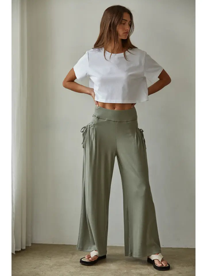 Knit Cotton Modal Spandex Waist Elastic Band Wide Leg Pants With Side Pockets And Tied Ribbon Trim